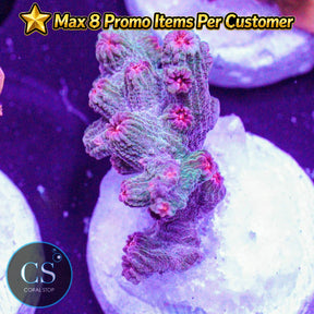 Cyphastrea Corals are small, encrusting corals that offer a stunning array of colors and patterns, including vibrant greens, blues, reds, and purples. Their unique growth form allows them to create a beautiful, textured mat across rocks and substrate, making them ideal for filling spaces or adding color to the lower and middle areas of your reef tank. Cyphastrea is known for its fast encrusting growth, which can quickly cover large areas of rock.
